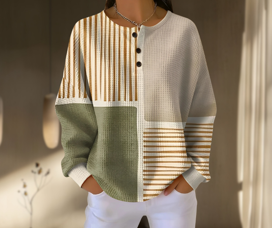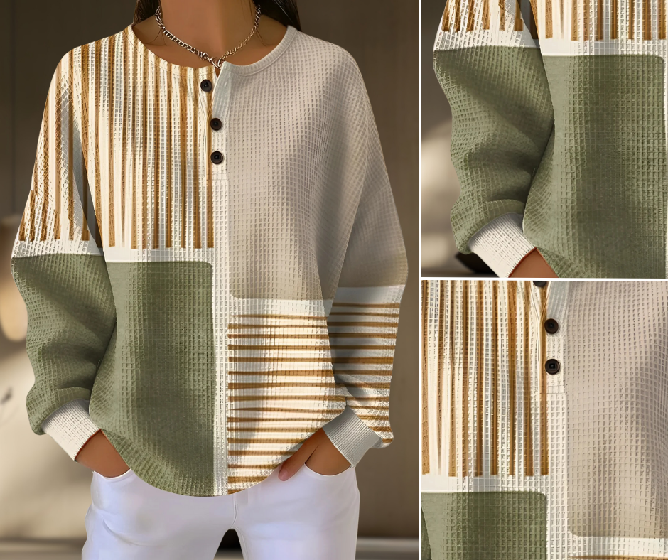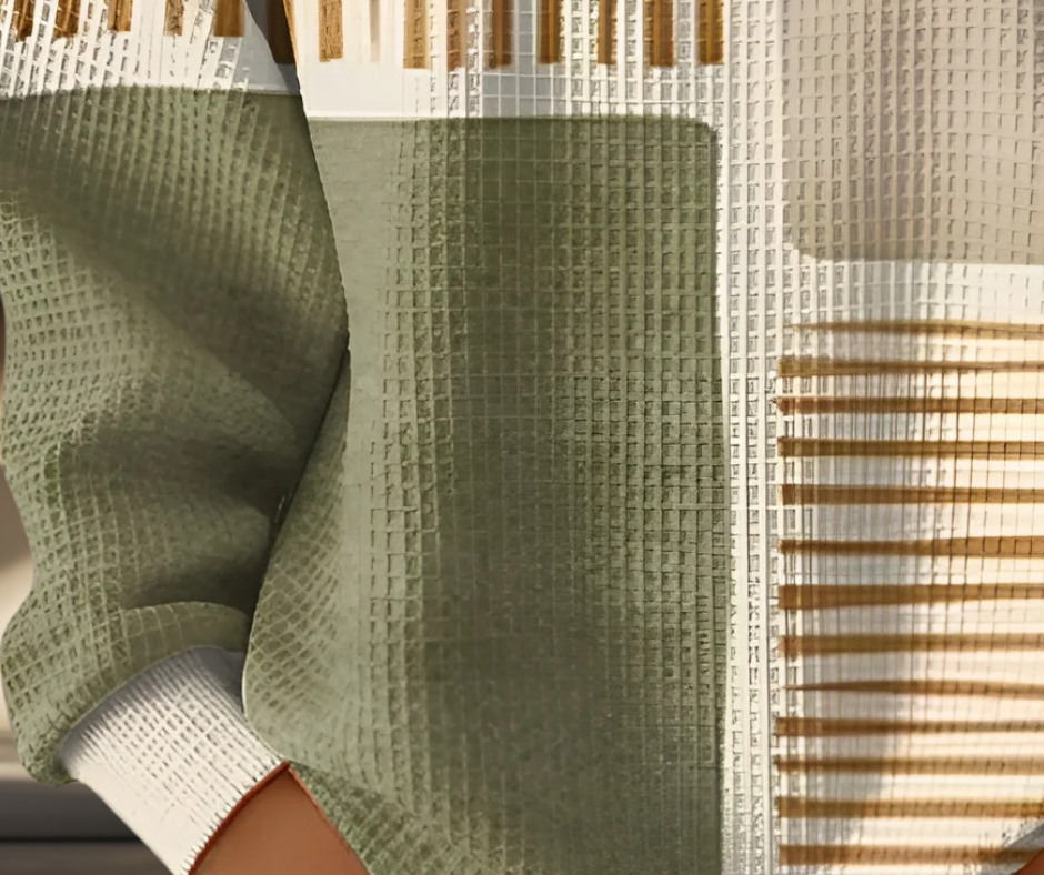 Resta piacevolmente al caldo quando fuori ci sono circa 5 °C: maglia a nido d’ape a doppio strato con interno spazzolato effetto pile per una morbidezza avvolgente, traspirante per evitare ogni sensazione di umidità, e una vestibilità elegante e rilassata che non aderisce a pancia o fianchi. Facile da abbinare a jeans, gonna midi o leggings — dalla mattina alla sera, senza appesantire la silhouette.